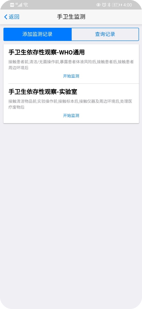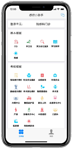包含各类考核、手卫生检测、荧光标记法监测、报表和统计、学习培训、考试测评、消息提醒 和沟通